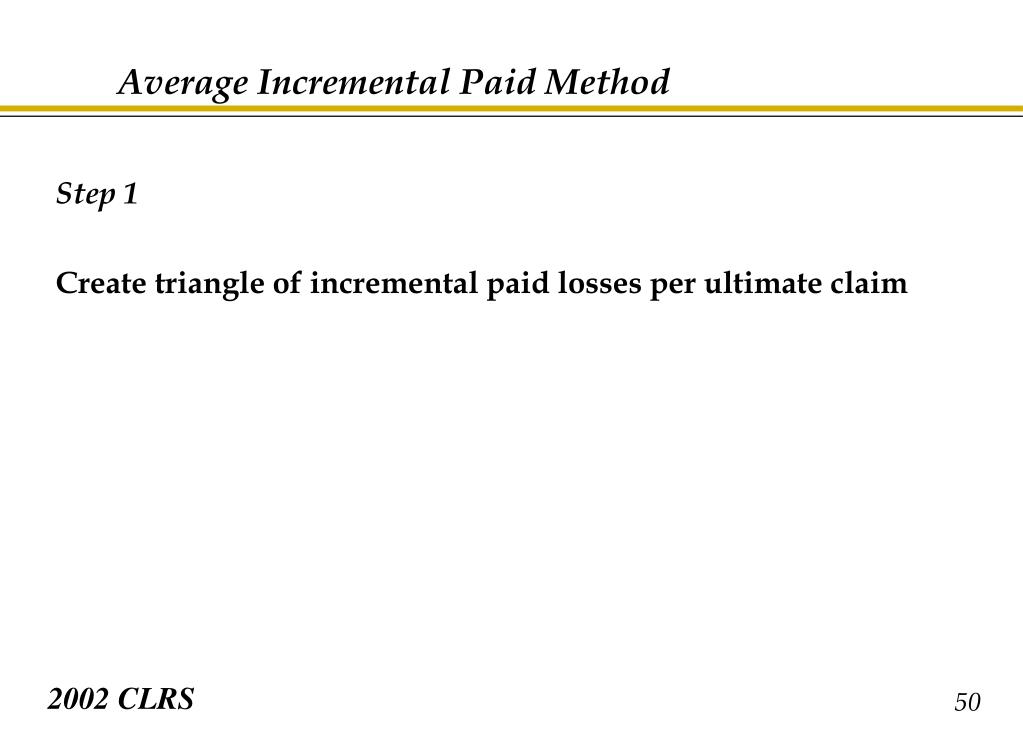 Step 1 Create triangle of incremental paid losses per ultimate claim Average Incremental Paid Method
