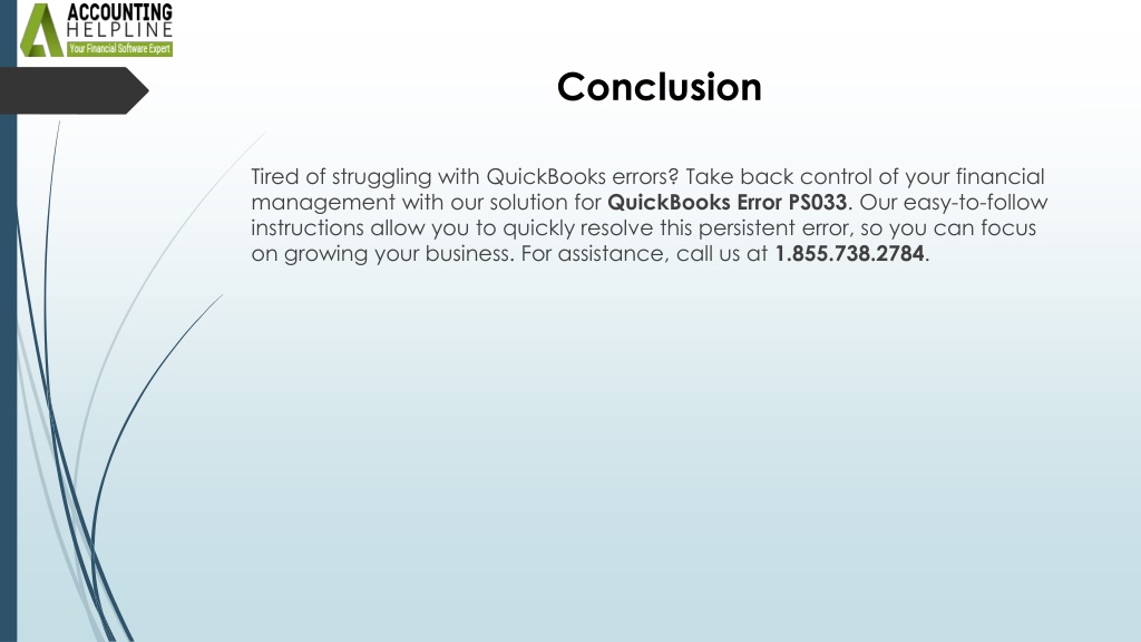 Conclusion Tired of struggling with QuickBooks errors? Take back control of your financial management with our solution for QuickBooks Error PS033. Our easy-to-follow instructions allow you to quickly resolve this persistent error, so you can focus on growing your business. For assistance, call us at 1.855.738.2784.