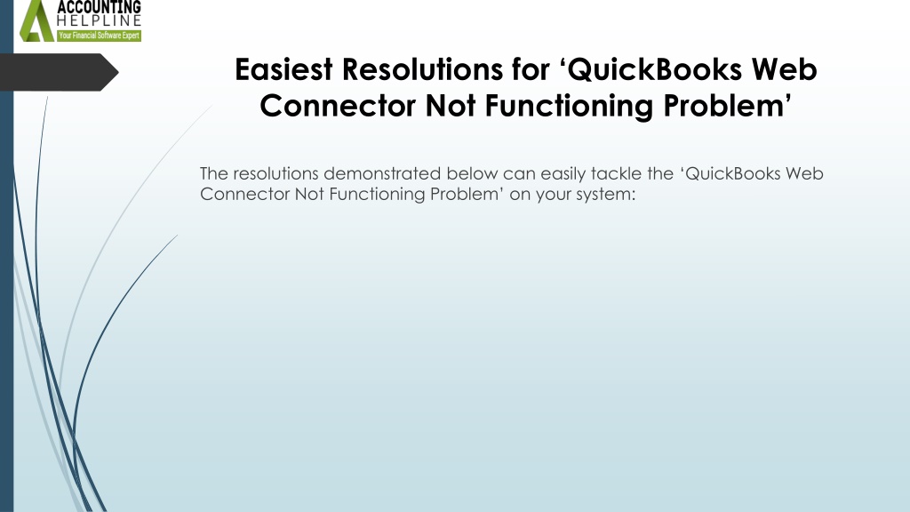 1. QuickBooks Web Connector Not Working: Perfect Resolutions QuickBooks Web Connector is a specialized application developed by Microsoft to help web-based applications successfully exchange data with the QB Desktop application. This application also works wonderfully with other versions, such as QB Point of Sale & QB Financial Software on the system. In some instances, users fail to launch QB Web Connector on the system & the relevant data exchange cannot be performed. Usually, an error message titled ‘QuickBooks Web Connector Not Working’ shows up on the screen, thereby informing the user that the web connector cannot be utilized for any task. The present blog contains fully verified step-by-step resolutions that you can effortlessly implement to tackle this problem. If you are severely disturbed due to the ‘QuickBooks Web Connector Not Working’ error message, you can dial 1.855.738.2784 to connect with our QB Professionals Team for guidance.