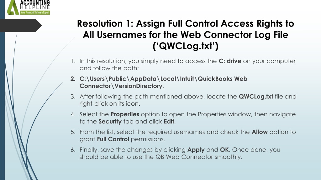 4. Resolution 1: Assign Full Control Access Rights to All Usernames for the Web Connector Log File (‘QWCLog.txt’) • In this resolution, you simply need to access the C: drive on your computer and follow the path: • C:\Users\Public\AppData\Local\Intuit\QuickBooks Web Connector\VersionDirectory. • After following the path mentioned above, locate the QWCLog.txt file and right-click on its icon. • Select the Properties option to open the Properties window, then navigate to the Security tab and click Edit. • From the list, select the required usernames and check the Allow option to grant Full Control permissions. • Finally, save the changes by clicking Apply and OK. Once done, you should be able to use the QB Web Connector smoothly.