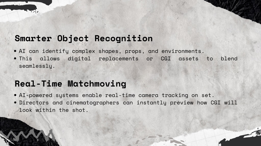 Smarter Object Recognition AI can identify complex shapes, props, and environments. This allows digital replacements or CGI assets to blend seamlessly. Real-Time Matchmoving AI-powered systems enable real-time camera tracking on set. Directors and cinematographers can instantly preview how CGI will look within the shot.