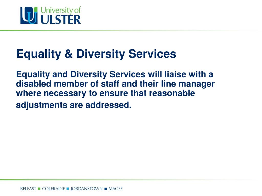 Equality & Diversity ServicesEquality and Diversity Services will liaise with a disabled member of staff and their line manager where necessary to ensure that reasonable adjustments are addressed.