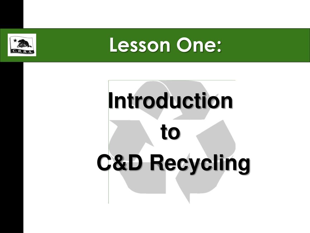 Course Outline Lesson One: Introduction to C&D Recycling Lesson Two: Barriers to C&D Recycling Lesson Three: Policies and Programs to Encourage C&D Recycling Lesson Four: Municipal C&D Ordinances Lesson Five: Disaster Debris Recycling Lesson Six: Markets For C&D Materials