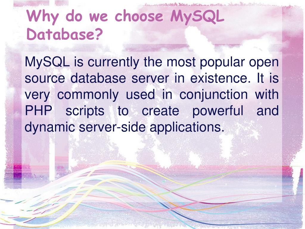 Why do we choose MySQL Database? MySQL is currently the most popular open source database server in existence. It is very commonly used in conjunction with PHP scripts to create powerful and dynamic server-side applications.