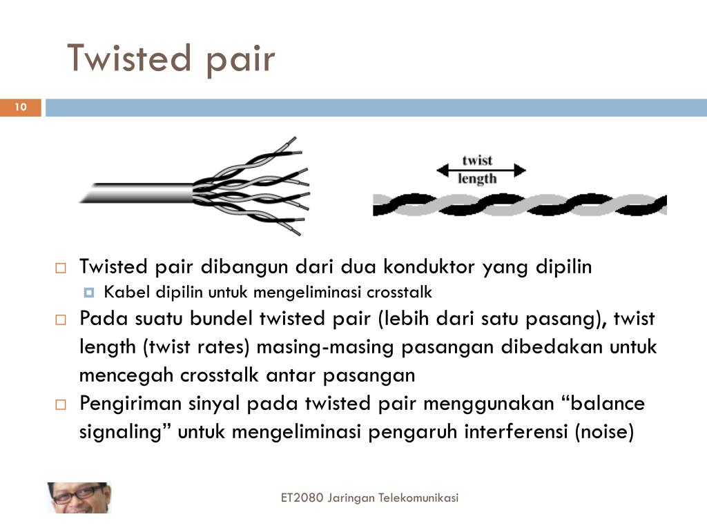 Twisted pair • Twisted pair dibangundariduakonduktor yang dipilin • Kabeldipilinuntukmengeliminasi crosstalk • Pada suatu bundel twisted pair (lebih dari satu pasang), twist length (twist rates) masing-masing pasangan dibedakan untuk mencegah crosstalk antar pasangan • Pengirimansinyalpada twisted pair menggunakan“balance signaling”untuk mengeliminasi pengaruhinterferensi (noise) ET2080 Jaringan Telekomunikasi