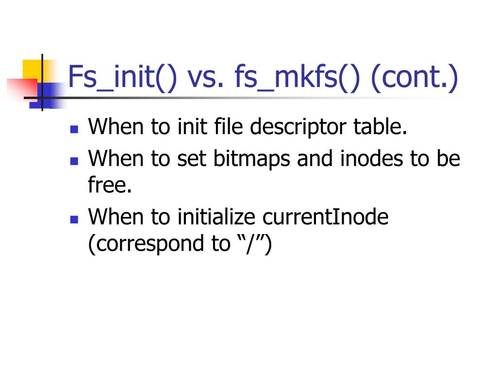 File System FAQ. Fs_init() vs. fs_mkfs(). What need to be done where: FS_init() takes care of system wise FS related initialization (Related to the running system). FS_mkfs() is doing the initialization of the FS itself. (Related to the specifics of FS on disk) How to tell: