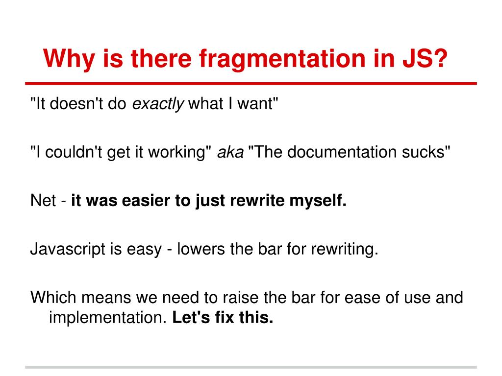 Why is there fragmentation in JS? "It doesn't do exactly what I want" "I couldn't get it working" aka "The documentation sucks" Net - it was easier to just rewrite myself. Javascript is easy - lowers the bar for rewriting. Which means we need to raise the bar for ease of use and implementation. Let's fix this.
