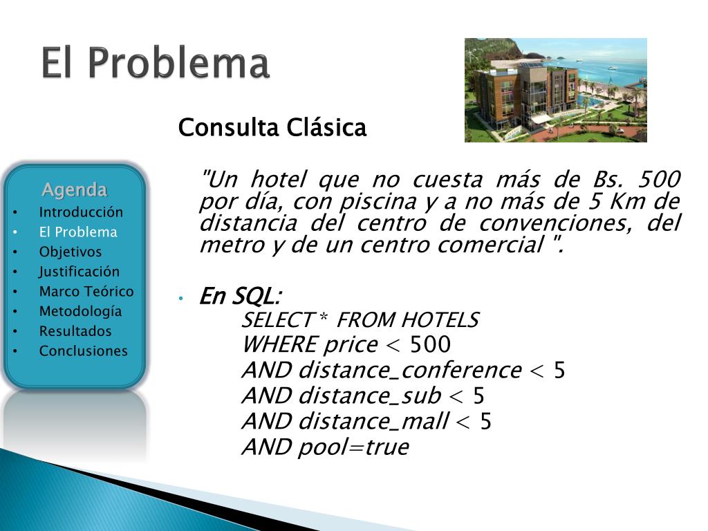 El Problema Consulta Clásica "Un hotel que no cuesta más de Bs. 500 por día, con piscina y a no más de 5 Km de distancia del centro de convenciones, del metro y de un centro comercial ". • En SQL: SELECT * FROM HOTELS WHERE price < 500 AND distance_conference< 5 AND distance_sub< 5 AND distance_mall< 5 AND pool=true • Agenda • Introducción • El Problema • Objetivos • Justificación • Marco Teórico • Metodología • Resultados • Conclusiones