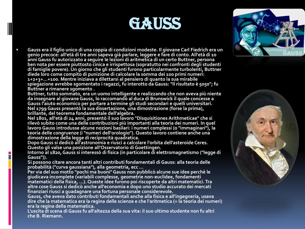 Gauss • Gauss era il figlio unico di una coppia di condizioni modeste. Il giovane Carl Fiedrich era un genio precoce: all'età di tre anni sapeva già parlare, leggere e fare di conto. All'età di 10 anni Gauss fu autorizzato a seguire le lezioni di aritmetica di un certo Buttner, persona ben nota per essere piuttosto cinica e irrispettosa (sopratutto nei confronti degli studenti di famiglie povere). Un giorno che gli studenti furono particolarmente turbolenti, Buttner diede loro come compito di punizione di calcolare la somma dei 100 primi numeri: 1+2+3+...+100. Mentre iniziava a dilettarsi al pensiero di quanto la sua mirabile spiegazione avrebbe sgomentato i ragazzi, fu interotto da Gauss: "Il risultato è 5050"; fu Buttner a rimanere sgomento . Buttner, tutto sommato, era un uomo intelligente e realizzando che non aveva più niente da insegnare al giovane Gauss, lo raccomandò al duca di Brunswick il quale concesse a Gauss l'aiuto economico per portare a termine gli studi secondari e quelli universitari.Nel 1799 Gauss presentò la sua dissertazione, una dimostrazione (forse la prima), brillante, del teorema fondamentale dell'algebra.Nel 1801, all'età di 24 anni, presentò il suo lavoro "Disquisitiones Arithmeticae" che si rilevò subito come una delle contribuzioni più importanti alla teoria dei numeri. In quel lavoro Gauss introdusse alcune nozioni basilari: i numeri complessi (o "immaginari"), la teoria delle congruenze (i "numeri dell'orologio"). Questo lavoro contiene anche una dimostrazione della legge di reciprocità quadratica.Dopo Gauss si dedicò all'astronomia e riuscì a calcolare l'orbita dell'asteroide Ceres. Questo gli valse una posizione all'Osservatorio di Goettingen.Intorno al 1820, Gauss si interessò di fisica (in particolare di elettromagnetismo ("legge di Gauss")). Si possono citare ancora tanti altri contributi fondamentali di Gauss: alla teoria delle probabilità ("curva gaussiana"), alla geometria, ecc ...Per via del suo motto "pochi ma buoni" Gauss non pubblicò alcune sue idee perchè le giudicava incomplete (variabili complesse, geometrie non-euclidee, fondamenti matematici della fisica, ...). Queste idee furono poi riscoperte da altri matematici. Tra altre cose Gauss si dedicò anche all'economia e dopo uno studio accurato dei mercati finanziari riusci a guadagnare una fortuna personale considerevole.Gauss, che aveva dato contributi fondamentali anche alla fisica e all'ingegneria, usava dire che la matematica era la regina delle scienze e che l'aritmetica (= la teoria dei numeri) era la regina della matematica. L'uscita di scena di Gauss fu all'altezza della sua vita: il suo ultimo studente non fu altri che B. Riemann.