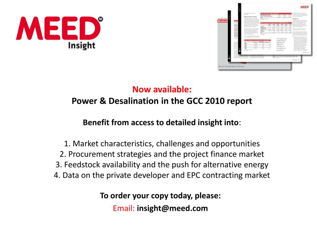 Now available:Power & Desalination in the GCC 2010 reportBenefit from access to detailed insight into:1. Market characteristics, challenges and opportunities 2. Procurement strategies and the project finance market 3. Feedstock availability and the push for alternative energy 4. Data on the private developer and EPC contracting market To order your copy today, please: Email:insight@meed.com