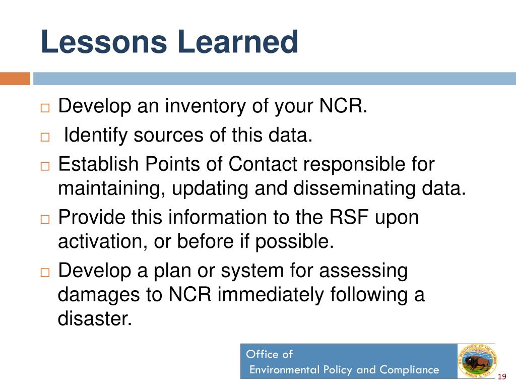 Lessons Learned • Develop an inventory of your NCR. • Identify sources of this data. • Establish Points of Contact responsible for maintaining, updating and disseminating data. • Provide this information to the RSF upon activation, or before if possible. • Develop a plan or system for assessing damages to NCR immediately following a disaster. Office of Environmental Policy and Compliance