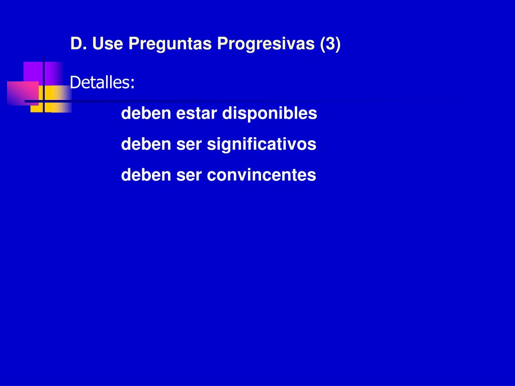 D. Use Preguntas Progresivas (3) Detalles: deben estar disponibles deben ser significativos deben ser convincentes
