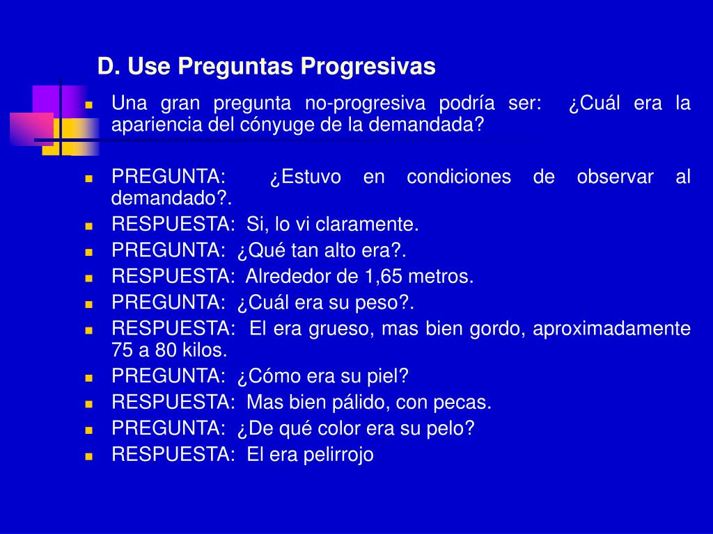 D. Use Preguntas Progresivas • Una gran pregunta no-progresiva podría ser: ¿Cuál era la apariencia del cónyuge de la demandada? • PREGUNTA: ¿Estuvo en condiciones de observar al demandado?. • RESPUESTA: Si, lo vi claramente. • PREGUNTA: ¿Qué tan alto era?. • RESPUESTA: Alrededor de 1,65 metros. • PREGUNTA: ¿Cuál era su peso?. • RESPUESTA: El era grueso, mas bien gordo, aproximadamente 75 a 80 kilos. • PREGUNTA: ¿Cómo era su piel? • RESPUESTA: Mas bien pálido, con pecas. • PREGUNTA: ¿De qué color era su pelo? • RESPUESTA: El era pelirrojo