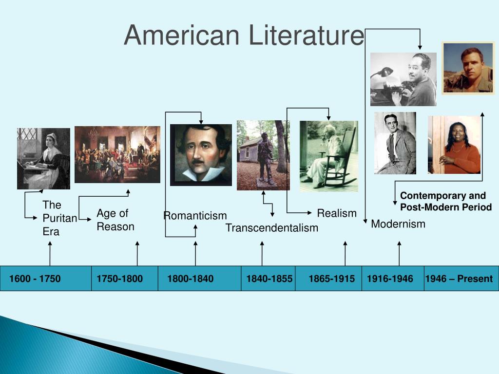 American Literature Contemporary and Post-Modern Period The Puritan Era Age of Reason Realism Romanticism Modernism Transcendentalism 1600 - 1750 1750-1800 1800-1840 1840-1855 1865-1915 1916-1946 1946 – Present