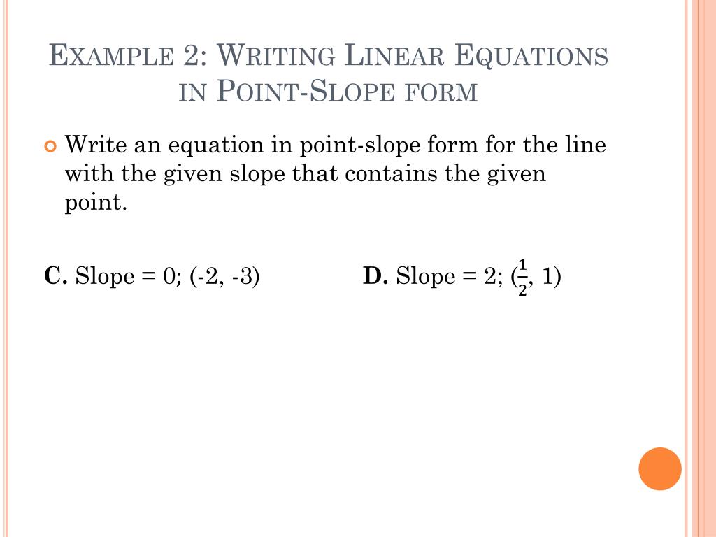 Example 2: Writing Linear Equations in Point-Slope form • Write an equation in point-slope form for the line with the given slope that contains the given point. C. Slope = 0(-2, -3)D. Slope = 2; (, 1)