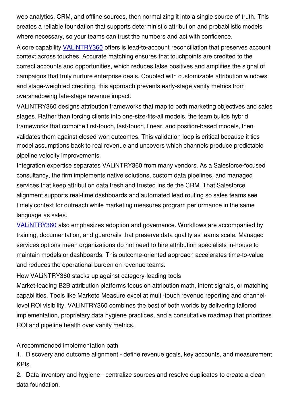 webanalytics,CRM,andofflinesources,thennormalizingitintoasinglesourceoftruth.This createsareliablefoundationthatsupportsdeterministicattributionandprobabilisticmodels wherenecessary,soyourteamscantrustthenumbersandactwithconfidence. AcorecapabilityVALiNTRY360offersislead-to-accountreconciliationthat preservesaccount contextacrosstouches.Accuratematchingensuresthattouchpointsarecreditedtothe correctaccountsandopportunities,whichreducesfalse positivesandamplifiesthesignalof campaignsthattrulynurtureenterprisedeals.Coupledwithcustomizableattributionwindows andstage-weightedcrediting,thisapproachpreventsearly-stagevanitymetricsfrom overshadowinglate-stagerevenueimpact. VALiNTRY360designsattributionframeworksthatmaptobothmarketingobjectivesandsales stages.Ratherthanforcingclientsintoone-size-fits-allmodels,theteambuilds hybrid frameworksthatcombinefirst-touch,last-touch,linear,andposition-basedmodels,then validatesthemagainstclosed-wonoutcomes.Thisvalidationloopiscriticalbecauseitties modelassumptionsbacktorealrevenueanduncoverswhichchannelsproducepredictable pipelinevelocityimprovements. IntegrationexpertiseseparatesVALiNTRY360frommanyvendors.AsaSalesforce-focused consultancy,thefirmimplementsnativesolutions,customdatapipelines,andmanaged servicesthatkeepattributiondatafreshandtrustedinsidetheCRM.ThatSalesforce alignmentsupportsreal-timedashboardsandautomatedleadroutingsosalesteamssee timelycontextforoutreachwhilemarketingmeasuresprogramperformanceinthesame language assales. VALiNTRY360alsoemphasizesadoptionandgovernance.Workflowsareaccompaniedby training,documentation,andguardrailsthatpreservedataqualityasteamsscale.Managed servicesoptionsmeanorganizationsdonotneedtohireattributionspecialistsin-houseto maintainmodelsordashboards.Thisoutcome-orientedapproachacceleratestime-to-value andreducestheoperationalburdenonrevenueteams. HowVALiNTRY360stacksupagainstcategory-leadingtools Market-leadingB2Battributionplatformsfocusonattributionmath,intentsignals,ormatching capabilities.ToolslikeMarketoMeasureexcelatmulti-touchrevenuereportingandchannel- levelROIvisibility.VALiNTRY360combinesthebestofbothworlds bydeliveringtailored implementation,proprietarydatahygienepractices,andaconsultativeroadmapthat prioritizes ROIandpipelinehealthovervanitymetrics. Arecommendedimplementationpath Discoveryandoutcomealignment-definerevenuegoals,keyaccounts,andmeasurement KPIs. Datainventoryand hygiene-centralizesourcesandresolveduplicatestocreateaclean datafoundation.