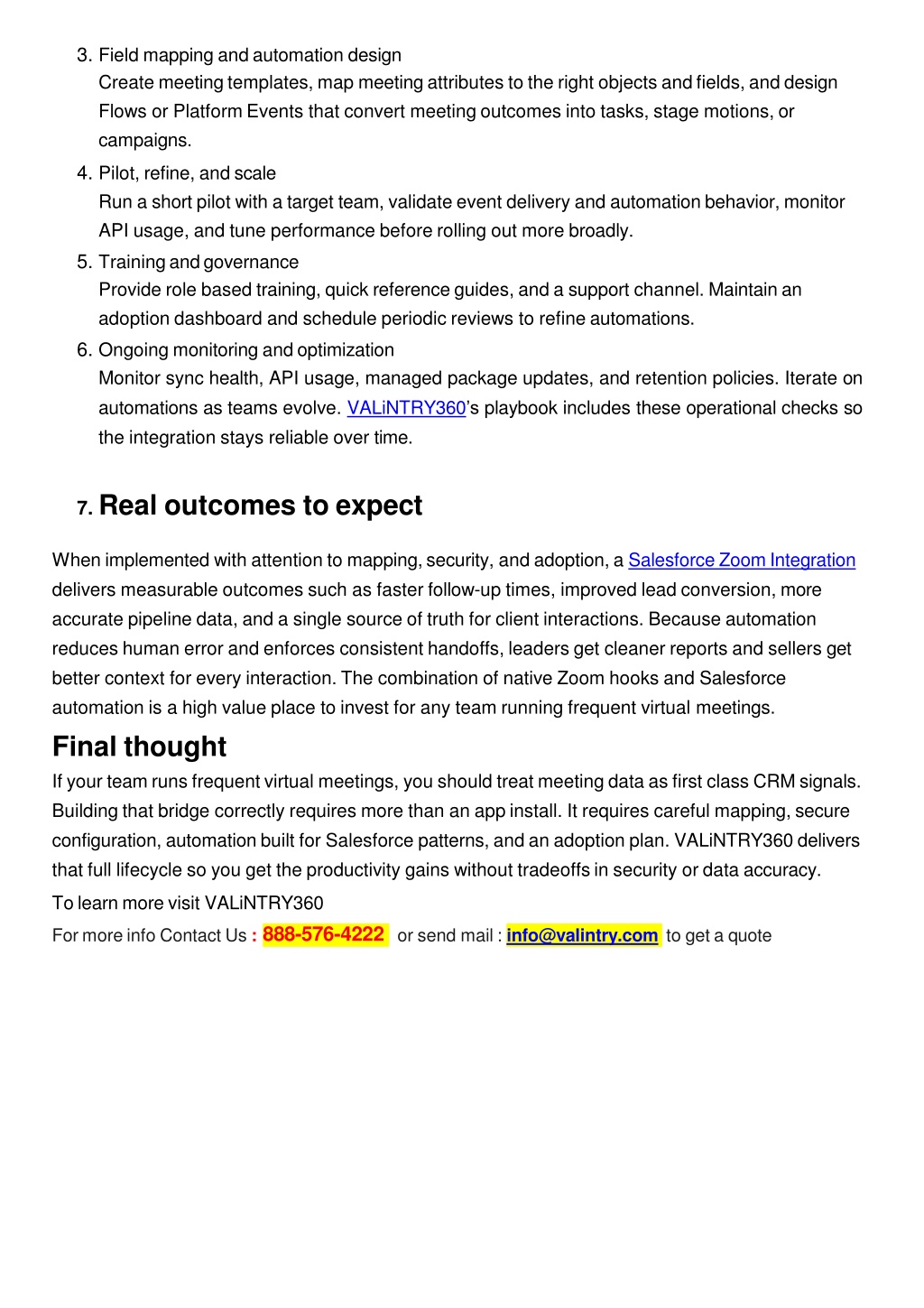 Fieldmappingandautomationdesign Createmeetingtemplates,mapmeetingattributestotherightobjectsandfields,anddesign FlowsorPlatformEventsthatconvertmeetingoutcomesintotasks,stagemotions,or campaigns. Pilot,refine,andscale Runashortpilotwithatargetteam,validateeventdeliveryandautomationbehavior,monitor APIusage,andtune performancebeforerollingoutmorebroadly. Trainingandgovernance Providerolebasedtraining,quickreferenceguides,andasupportchannel.Maintainan adoptiondashboardandscheduleperiodicreviewstorefineautomations. Ongoingmonitoringandoptimization Monitorsynchealth,APIusage,managedpackageupdates,andretentionpolicies.Iterate on automations asteamsevolve.VALiNTRY360’splaybookincludestheseoperationalchecksso theintegrationstaysreliableovertime. Realoutcomestoexpect Whenimplementedwithattentiontomapping,security,andadoption,aSalesforceZoomIntegrationdeliversmeasurableoutcomessuchasfasterfollow-uptimes,improvedleadconversion,more accuratepipelinedata,andasinglesourceoftruthforclientinteractions.Becauseautomation reduceshumanerrorandenforcesconsistenthandoffs,leadersgetcleanerreportsandsellersget bettercontextforeveryinteraction.ThecombinationofnativeZoomhooksand Salesforce automationisahighvalueplacetoinvestforanyteamrunningfrequent virtualmeetings. Finalthought Ifyourteamrunsfrequentvirtualmeetings,youshouldtreatmeetingdataasfirstclassCRMsignals. Buildingthatbridgecorrectlyrequiresmorethananappinstall.Itrequirescarefulmapping,secure configuration,automationbuiltforSalesforcepatterns,andanadoptionplan.VALiNTRY360delivers thatfulllifecyclesoyougettheproductivitygainswithouttradeoffsinsecurityordataaccuracy. TolearnmorevisitVALiNTRY360 FormoreinfoContactUs: orsendmail: togetaquote 888-576-4222 info@valintry.com