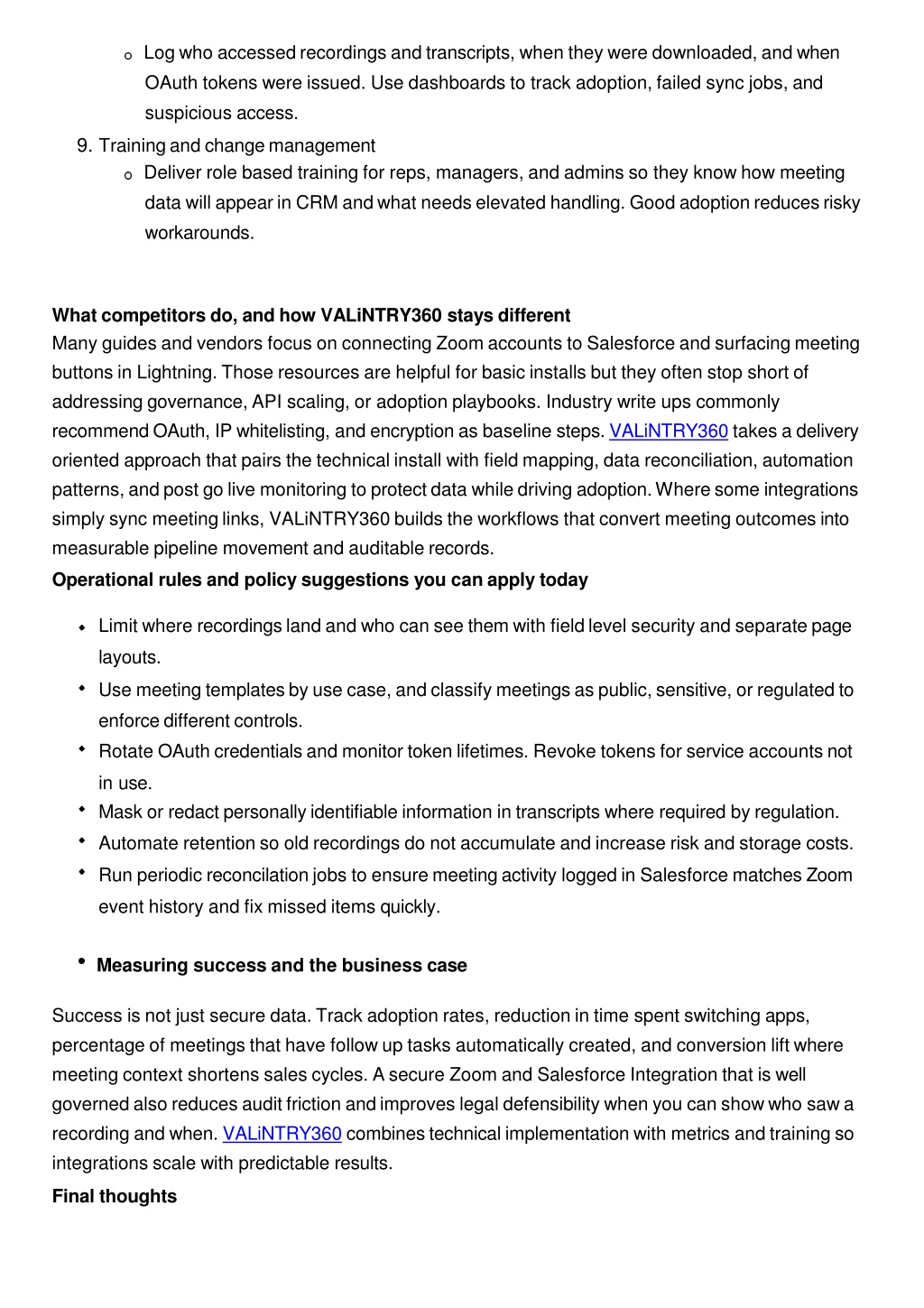 Logwhoaccessedrecordingsandtranscripts,whentheyweredownloaded,andwhen OAuthtokenswereissued.Usedashboardstotrackadoption,failedsyncjobs, and suspicious access. 9.Trainingandchangemanagement Deliverrolebasedtrainingforreps,managers,andadminssotheyknowhowmeeting datawillappearinCRMandwhatneedselevatedhandling.Goodadoptionreducesrisky workarounds. Whatcompetitorsdo,andhowVALiNTRY360staysdifferent ManyguidesandvendorsfocusonconnectingZoomaccountstoSalesforceandsurfacingmeeting buttonsinLightning.Thoseresourcesarehelpfulforbasicinstallsbuttheyoftenstopshortof addressinggovernance,APIscaling,oradoptionplaybooks.Industrywriteups commonly recommendOAuth,IPwhitelisting,andencryptionasbaselinesteps.VALiNTRY360takesadelivery orientedapproachthatpairsthetechnicalinstallwithfieldmapping,datareconciliation,automation patterns,andpostgolivemonitoringtoprotectdatawhiledrivingadoption.Wheresomeintegrations simplysyncmeetinglinks,VALiNTRY360buildstheworkflowsthatconvertmeetingoutcomesinto measurablepipeline movement andauditablerecords. Operationalrulesandpolicysuggestionsyoucanapplytoday Limitwhererecordingslandandwhocanseethemwithfieldlevelsecurityandseparatepage layouts. Usemeetingtemplatesbyusecase,andclassifymeetingsaspublic,sensitive,orregulatedto enforcedifferentcontrols. RotateOAuthcredentialsandmonitortokenlifetimes.Revoketokensforserviceaccountsnot inuse. Maskorredactpersonallyidentifiableinformation intranscriptswhererequiredbyregulation. Automateretentionsooldrecordingsdonotaccumulateandincreaseriskandstoragecosts. RunperiodicreconcilationjobstoensuremeetingactivityloggedinSalesforcematchesZoom eventhistoryandfixmisseditemsquickly. Measuringsuccessandthebusinesscase Successisnotjustsecuredata.Trackadoptionrates,reductionintimespentswitchingapps, percentageofmeetingsthathavefollowuptasksautomaticallycreated,andconversionliftwhere meetingcontextshortenssalescycles.AsecureZoomandSalesforceIntegrationthatiswell governedalsoreducesauditfrictionandimproveslegaldefensibilitywhenyoucanshowwhosawa recordingandwhen.VALiNTRY360combinestechnicalimplementationwithmetricsandtrainingso integrationsscalewithpredictableresults. Finalthoughts