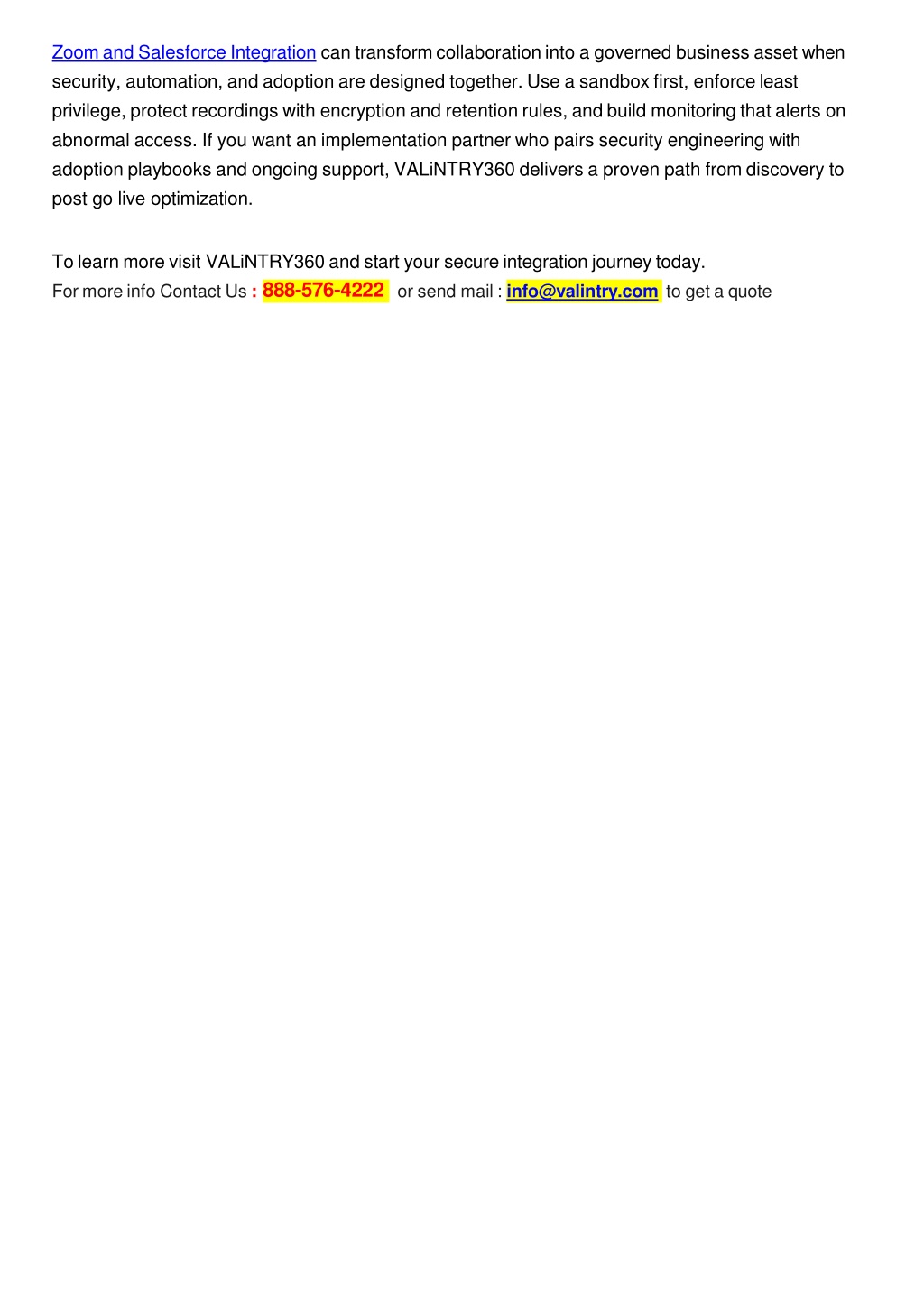 ZoomandSalesforceIntegrationcantransformcollaborationintoagovernedbusinessassetwhen security,automation,andadoptionaredesignedtogether.Useasandboxfirst,enforceleast privilege,protectrecordingswithencryptionandretentionrules,andbuildmonitoringthatalertson abnormalaccess.Ifyouwantanimplementationpartnerwhopairssecurityengineeringwith adoptionplaybooksandongoingsupport,VALiNTRY360deliversaprovenpathfromdiscoveryto post golive optimization. TolearnmorevisitVALiNTRY360andstartyoursecureintegrationjourneytoday. FormoreinfoContactUs: orsendmail: togetaquote 888-576-4222 info@valintry.com