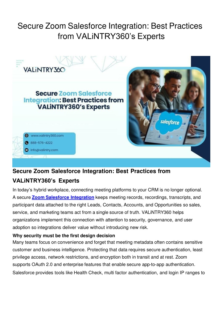 SecureZoomSalesforceIntegration:BestPractices fromVALiNTRY360’sExperts SecureZoomSalesforceIntegration:BestPracticesfrom VALiNTRY360’sExperts Intoday’shybridworkplace,connectingmeetingplatformstoyourCRMisnolongeroptional. AsecureZoomSalesforce Integrationkeepsmeetingrecords,recordings,transcripts,and participantdataattachedtotherightLeads,Contacts,Accounts,andOpportunities sosales, service,andmarketingteamsactfromasinglesourceoftruth. VALiNTRY360helps organizations implementthis connectionwith attentiontosecurity,governance,anduser adoptionsointegrationsdelivervaluewithoutintroducing newrisk. Whysecuritymustbethefirstdesigndecision Manyteamsfocusonconvenienceandforgetthatmeetingmetadataoftencontainssensitive customerandbusinessintelligence.Protectingthatdatarequiressecureauthentication,least privilegeaccess,networkrestrictions,andencryptionbothintransitandatrest.Zoom supportsOAuth2.0andenterprisefeaturesthatenablesecureapp-to-appauthentication. Salesforceprovides toolslikeHealthCheck,multifactorauthentication,and login IPranges to