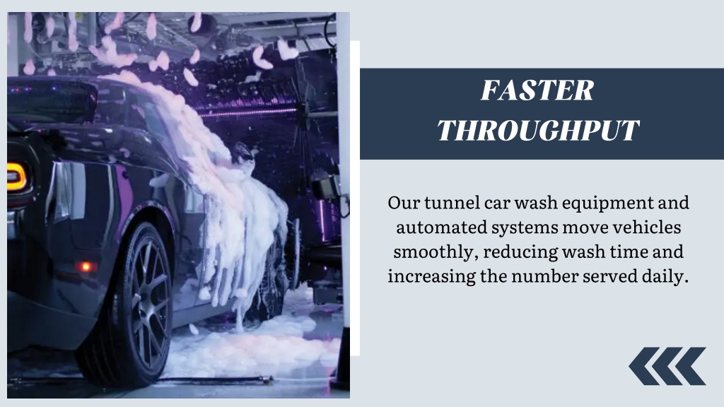 FASTER THROUGHPUT Our tunnel car wash equipment and automated systems move vehicles smoothly, reducing wash time and increasing the number served daily.