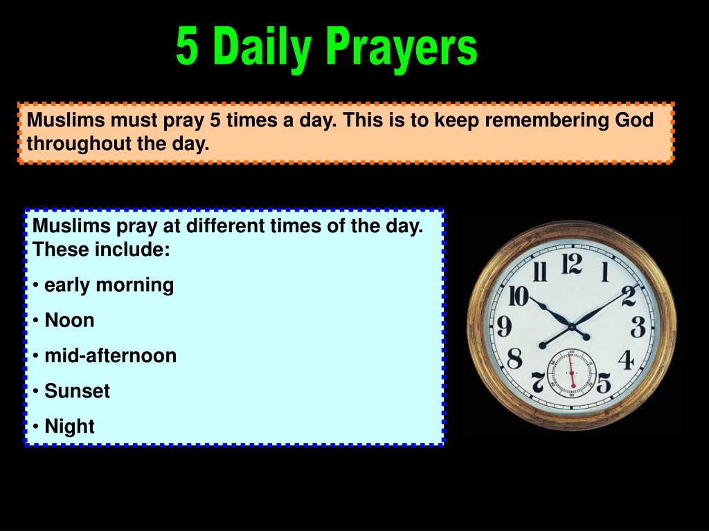 5 Daily Prayers Muslims must pray 5 times a day. This is to keep remembering God throughout the day. • Muslims pray at different times of the day. These include: • early morning • Noon • mid-afternoon • Sunset • Night