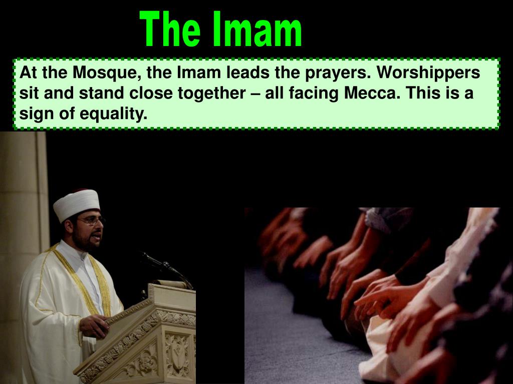 The Imam At the Mosque, the Imam leads the prayers. Worshippers sit and stand close together – all facing Mecca. This is a sign of equality.