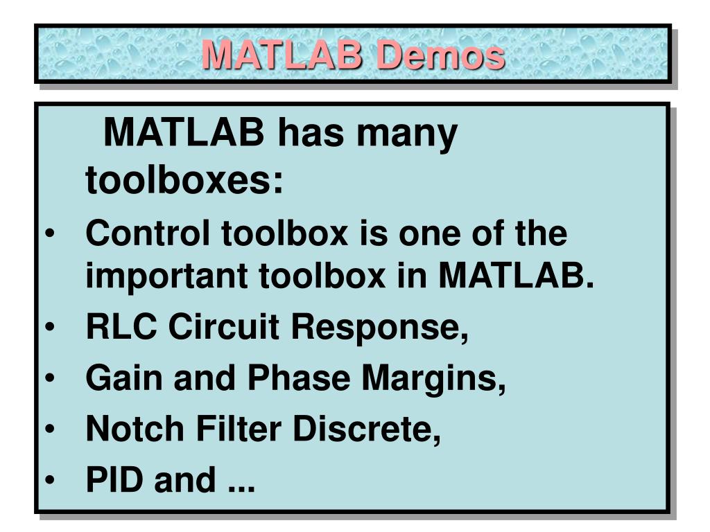 MATLAB Demos MATLAB has many toolboxes: • Control toolbox is one of the important toolbox in MATLAB. • RLC Circuit Response, • Gain and Phase Margins, • Notch Filter Discrete, • PID and ...