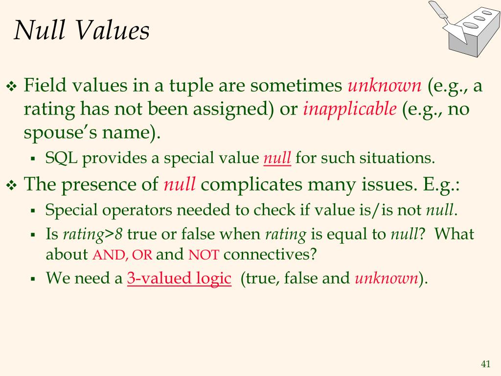 Null Values • Field values in a tuple are sometimes unknown(e.g., a rating has not been assigned) or inapplicable(e.g., no spouse’s name). • SQL provides a special value null for such situations. • The presence of null complicates many issues. E.g.: • Special operators needed to check if value is/is not null. • Is rating>8 true or false when rating is equal to null? What about AND, OR and NOT connectives? • We need a 3-valued logic(true, false and unknown).