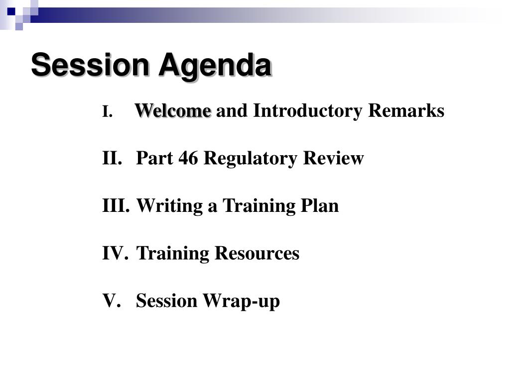 Session Agenda • I. Welcome and Introductory Remarks • Part 46 Regulatory Review • Writing a Training Plan • Training Resources • Session Wrap-up