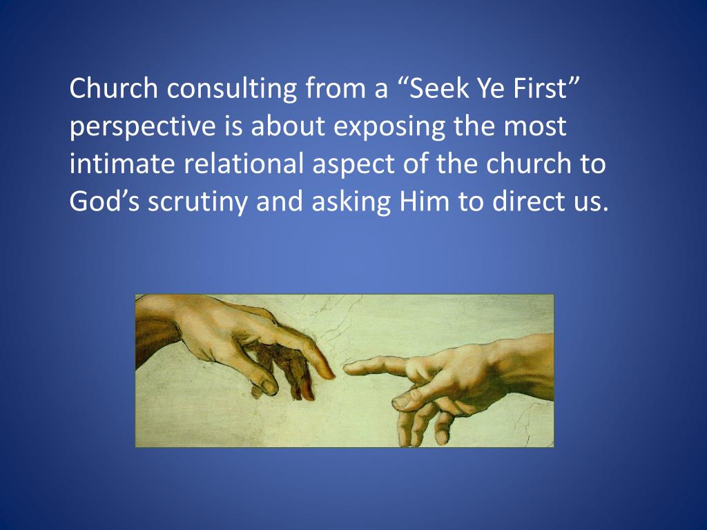 Church consulting from a “Seek Ye First” perspective is about exposing the most intimate relational aspect of the church to God’s scrutiny and asking Him to direct us.