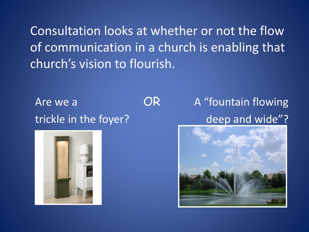 Consultation looks at whether or not the flow of communication in a church is enabling that church’s vision to flourish. Are we a OR A “fountain flowing trickle in the foyer?deep and wide”?