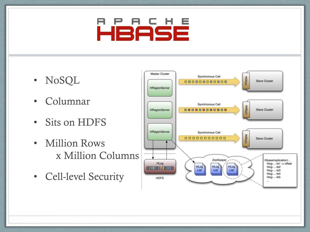 NoSQL • Columnar • Sits on HDFS • Million Rows x Million Columns • Cell-level Security