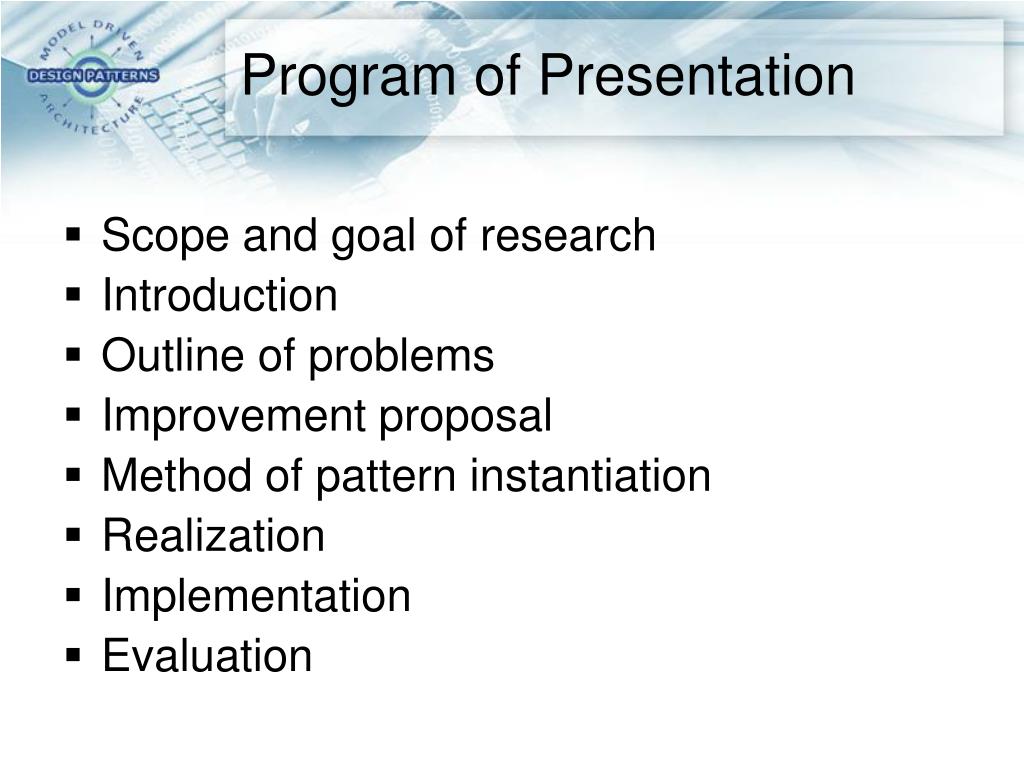 Program of Presentation • Scope and goal of research • Introduction • Outline of problems • Improvement proposal • Method of pattern instantiation • Realization • Implementation • Evaluation
