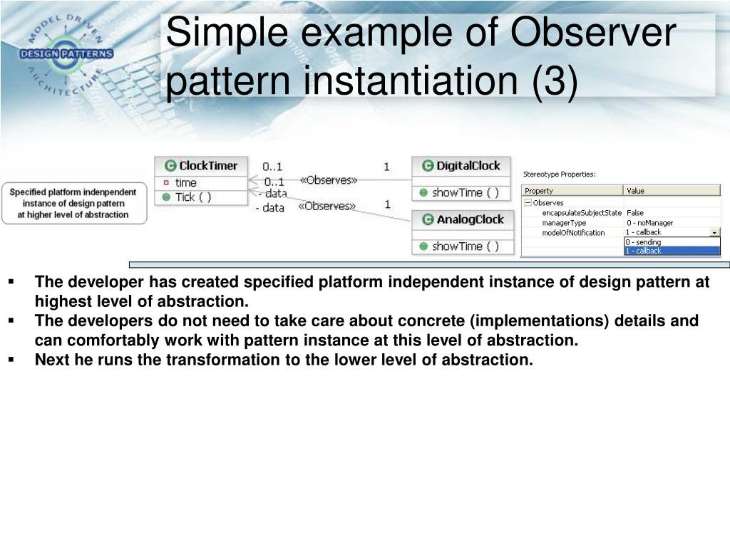 Simple example of Observer pattern instantiation (3) • The developer has created specified platform independent instance of design pattern at highest level of abstraction. • The developers do not need to take care about concrete (implementations) details and can comfortably work with pattern instance at this level of abstraction. • Next he runs the transformation to the lower level of abstraction.
