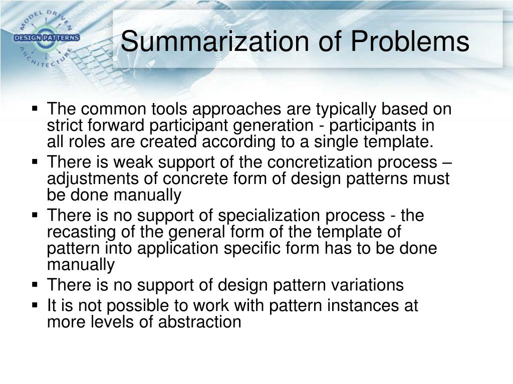 Summarization of Problems • The common tools approaches are typically based on strict forward participant generation - participants in all roles are created according to a single template. • There is weak support of the concretization process – adjustments of concrete form of design patterns must be done manually • There is no support of specialization process - the recasting of the general form of the template of pattern into application specific form has to be done manually • There is no support of design pattern variations • It is not possible to work with pattern instances at more levels of abstraction