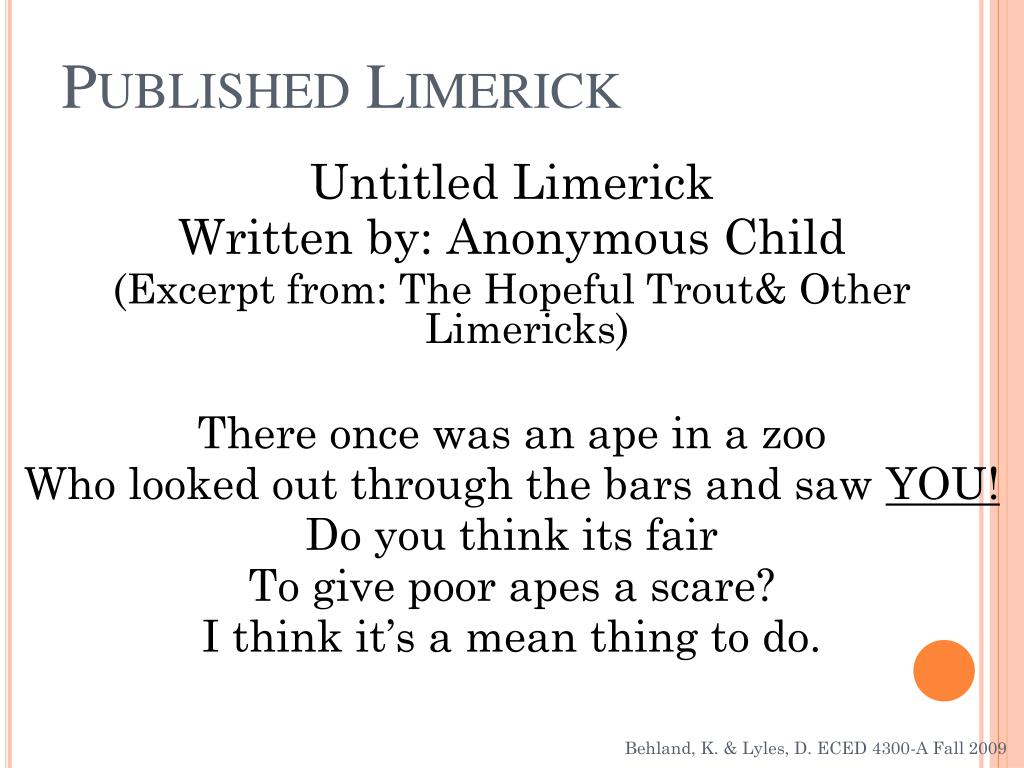 Published Limerick Untitled Limerick Written by: Anonymous Child (Excerpt from: The Hopeful Trout& Other Limericks) There once was an ape in a zoo Who looked out through the bars and saw YOU! Do you think its fair To give poor apes a scare? I think it’s a mean thing to do. Behland, K. & Lyles, D. ECED 4300-A Fall 2009