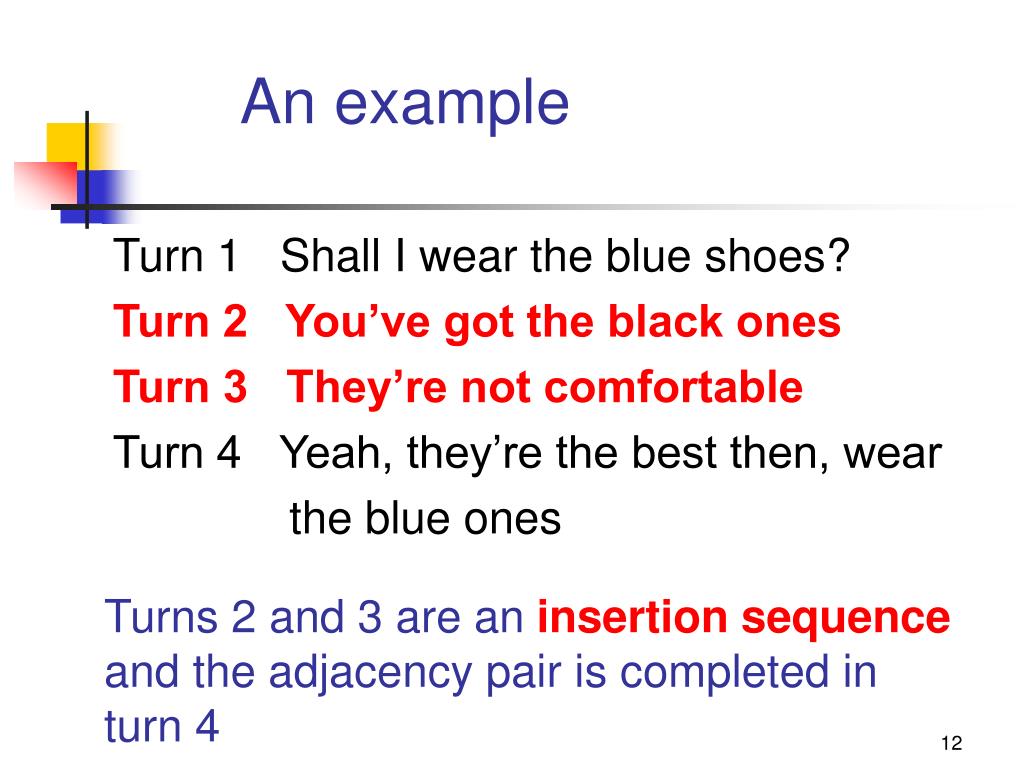 An exampleTurns 2 and 3 are an insertion sequence and the adjacency pair is completed in turn 4 Turn 1 Shall I wear the blue shoes? Turn 2 You’ve got the black ones Turn 3 They’re not comfortable Turn 4 Yeah, they’re the best then, wear the blue ones