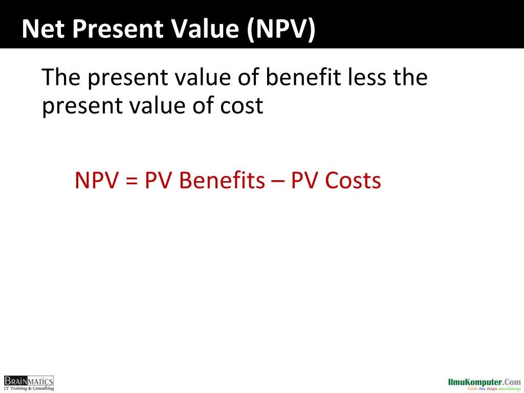 Net Present Value (NPV) The present value of benefit less the present value of cost NPV = PV Benefits – PV Costs