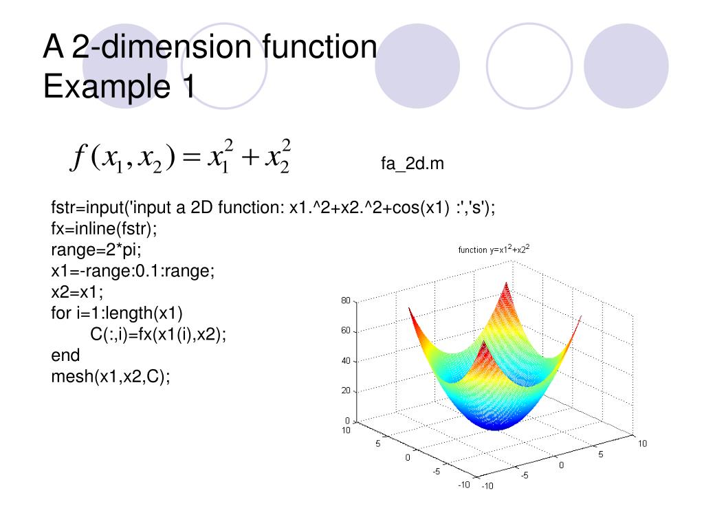 A 2-dimension functionExample 1 fa_2d.m fstr=input('input a 2D function: x1.^2+x2.^2+cos(x1) :','s'); fx=inline(fstr); range=2*pi; x1=-range:0.1:range; x2=x1; for i=1:length(x1) C(:,i)=fx(x1(i),x2); end mesh(x1,x2,C);