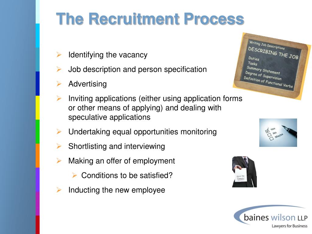 The Recruitment Process • Identifying the vacancy • Job description and person specification • Advertising • Inviting applications (either using application forms or other means of applying) and dealing with speculative applications • Undertaking equal opportunities monitoring • Shortlisting and interviewing • Making an offer of employment • Conditions to be satisfied? • Inducting the new employee