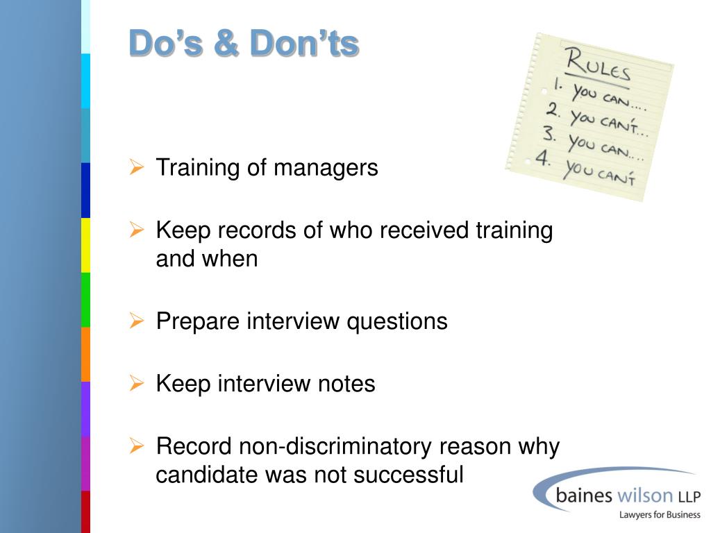 Do’s & Don’ts • Training of managers • Keep records of who received training and when • Prepare interview questions • Keep interview notes • Record non-discriminatory reason why candidate was not successful
