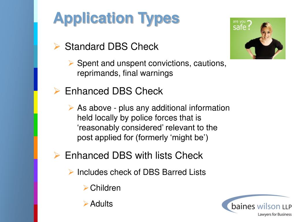 Application Types • Standard DBS Check • Spent and unspent convictions, cautions, reprimands, final warnings • Enhanced DBS Check • As above - plus any additional information held locally by police forces that is ‘reasonably considered’ relevant to the post applied for (formerly ‘might be’) • Enhanced DBS with lists Check • Includes check of DBS Barred Lists • Children • Adults