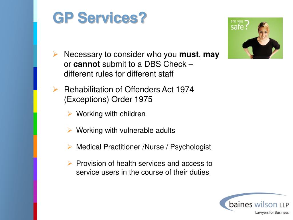 GP Services? • Necessary to consider who you must, may or cannot submit to a DBS Check – different rules for different staff • Rehabilitation of Offenders Act 1974 (Exceptions) Order 1975 • Working with children • Working with vulnerable adults • Medical Practitioner /Nurse / Psychologist • Provision of health services and access to service users in the course of their duties