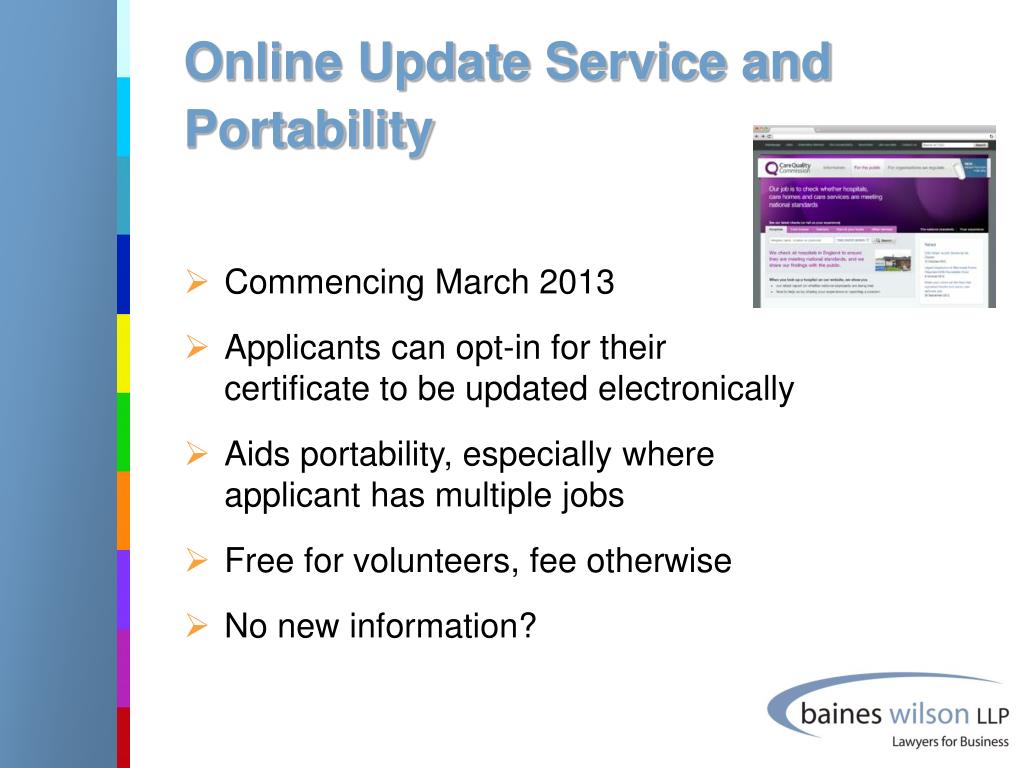 Online Update Service and Portability • Commencing March 2013 • Applicants can opt-in for their certificate to be updated electronically • Aids portability, especially where applicant has multiple jobs • Free for volunteers, fee otherwise • No new information?