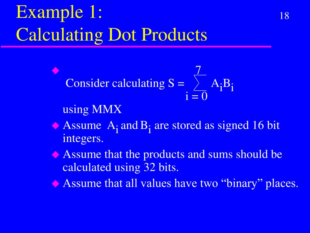 Example 1: Calculating Dot Products • 7 Consider calculating S = AiBii = 0using MMX • Assume AiandBi are stored as signed 16 bit integers. • Assume that the products and sums should be calculated using 32 bits. • Assume that all values have two “binary” places.