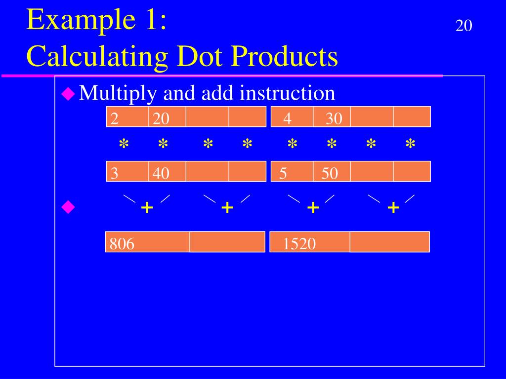 2 20 4 30 3 40 5 50 806 1520 Example 1: Calculating Dot Products • Multiply and add instruction * * * * * * * * • + + + +