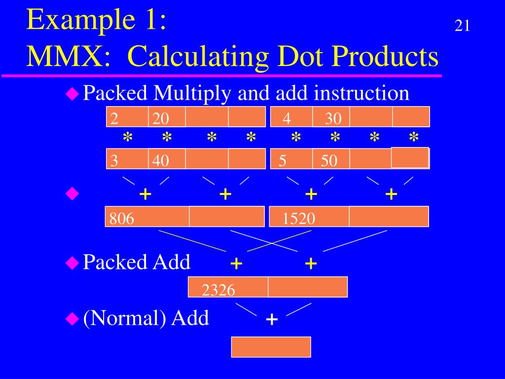 Example 1: MMX: Calculating Dot Products • Packed Multiply and add instruction * * * * * * * * • + + + + • Packed Add + + • (Normal) Add + 2 20 4 30 3 40 5 50 806 1520 2326