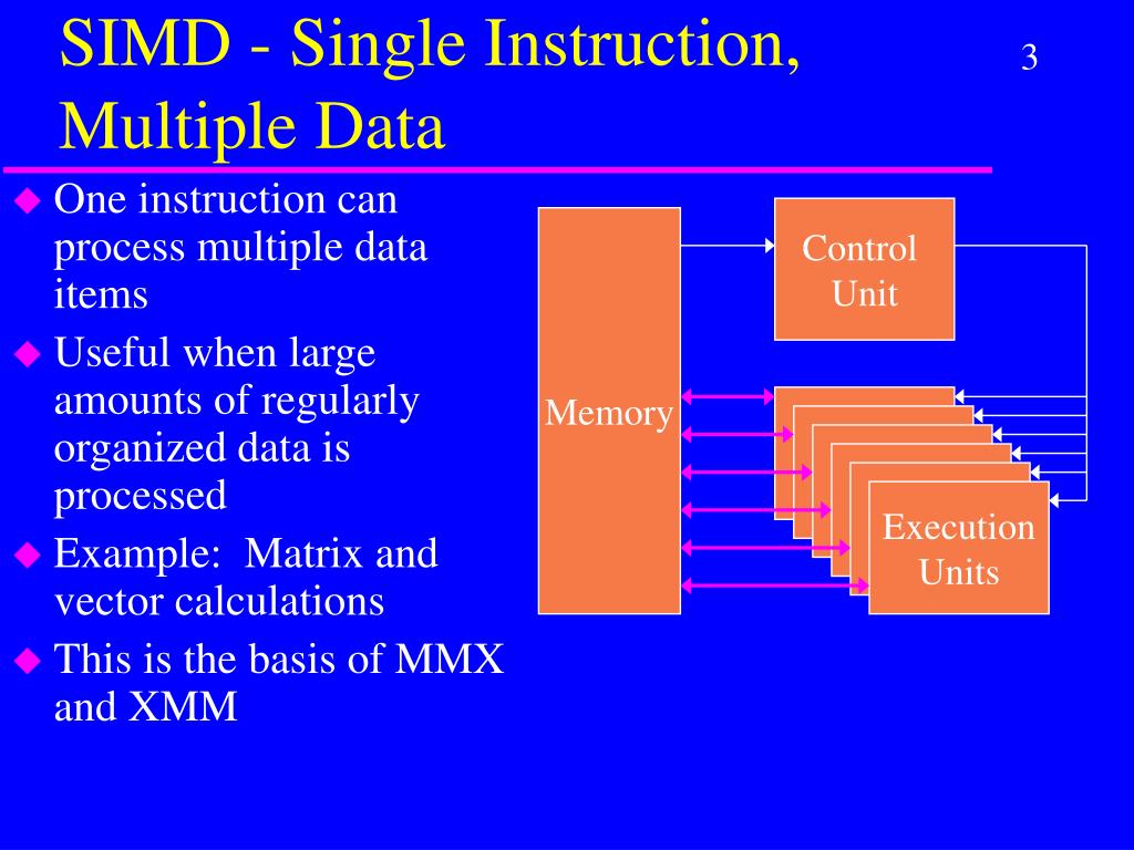 SIMD - Single Instruction, Multiple Data Control Unit • One instruction can process multiple data items • Useful when large amounts of regularly organized data is processed • Example: Matrix and vector calculations • This is the basis of MMX and XMM Memory ExecutionUnits