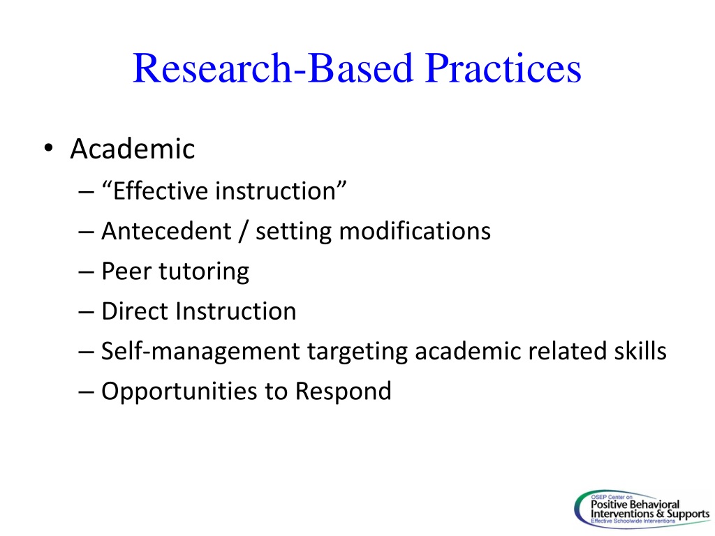 Research-Based Practices • Academic • “Effective instruction” • Antecedent / setting modifications • Peer tutoring • Direct Instruction • Self-management targeting academic related skills • Opportunities to Respond